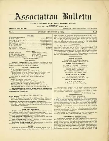 The National Association of Waste Material Dealers is formed in Boston. The group renames itself to the National Association of Secondary Material Industries in 1960, and the National Association of Recycling Industries in 1974.