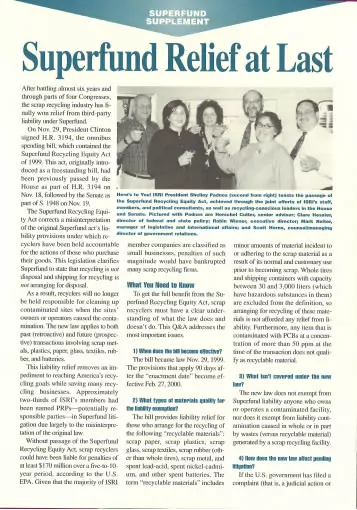 ISRI and our members secure passage of the Superfund Recycling Equity Act (SREA), after intense lobbying and grassroots efforts. SREA corrects an unintended consequence of the Superfund that resulted in hundreds of millions of dollars of Superfund liability being imposed on the recycling industry.