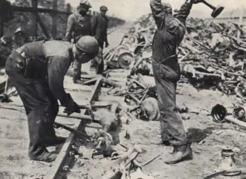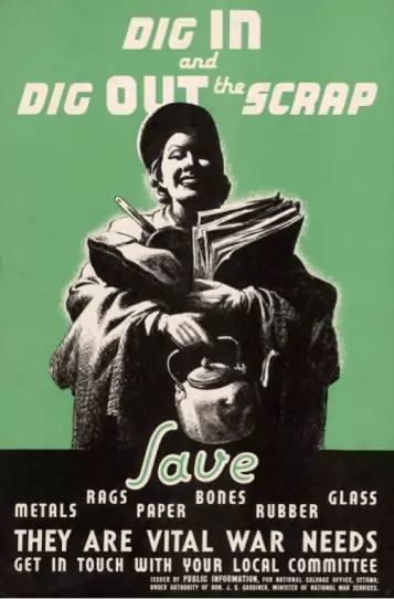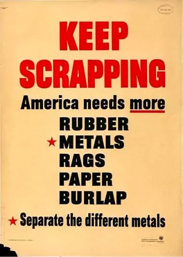 Recycling demand rises to meet U.S. war production needs during World War II. Citizens participate in recycling drives to collect everything from clothes and paper to metals and rubber.