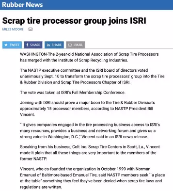 ISRI acquires the National Association of Scrap Tire Processors, whose members become our Tire and Rubber Division and Scrap Tire Processors Chapter.