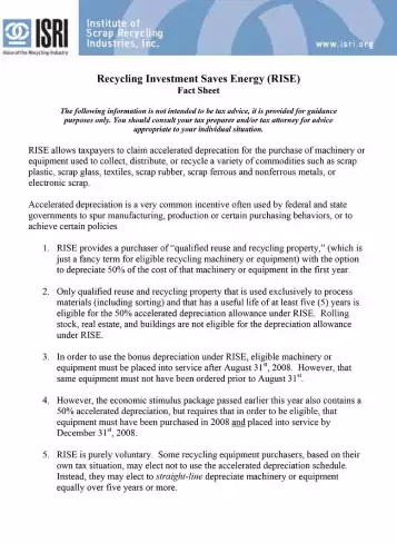 ISRI successfully lobbies Congress to enact the RISE Act, a depreciation allowance on recycling equipment. RISE allows taxpayers to claim accelerated depreciation for the purchase of machinery or equipment used to collect, distribute, or recycle a variety of commodities.